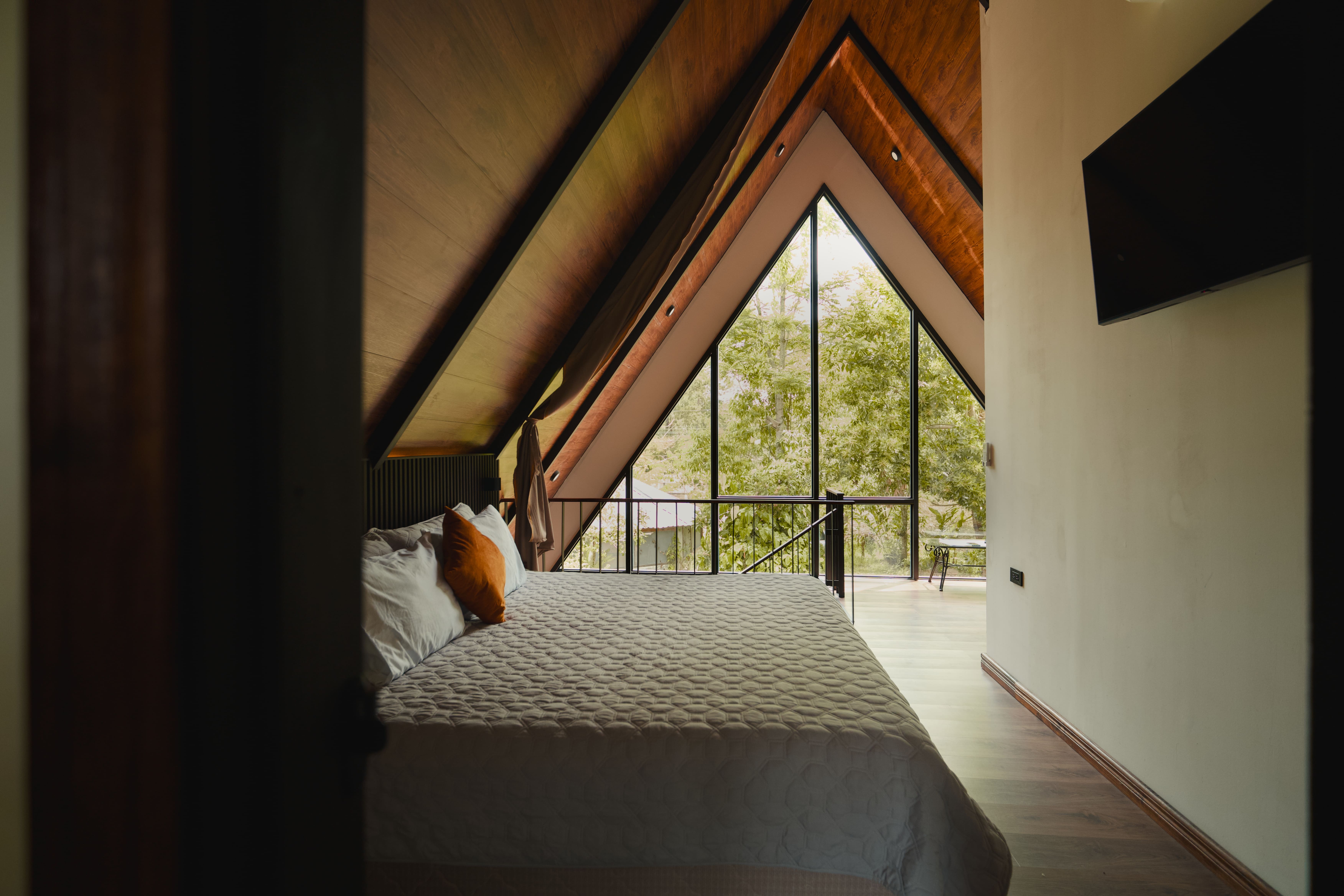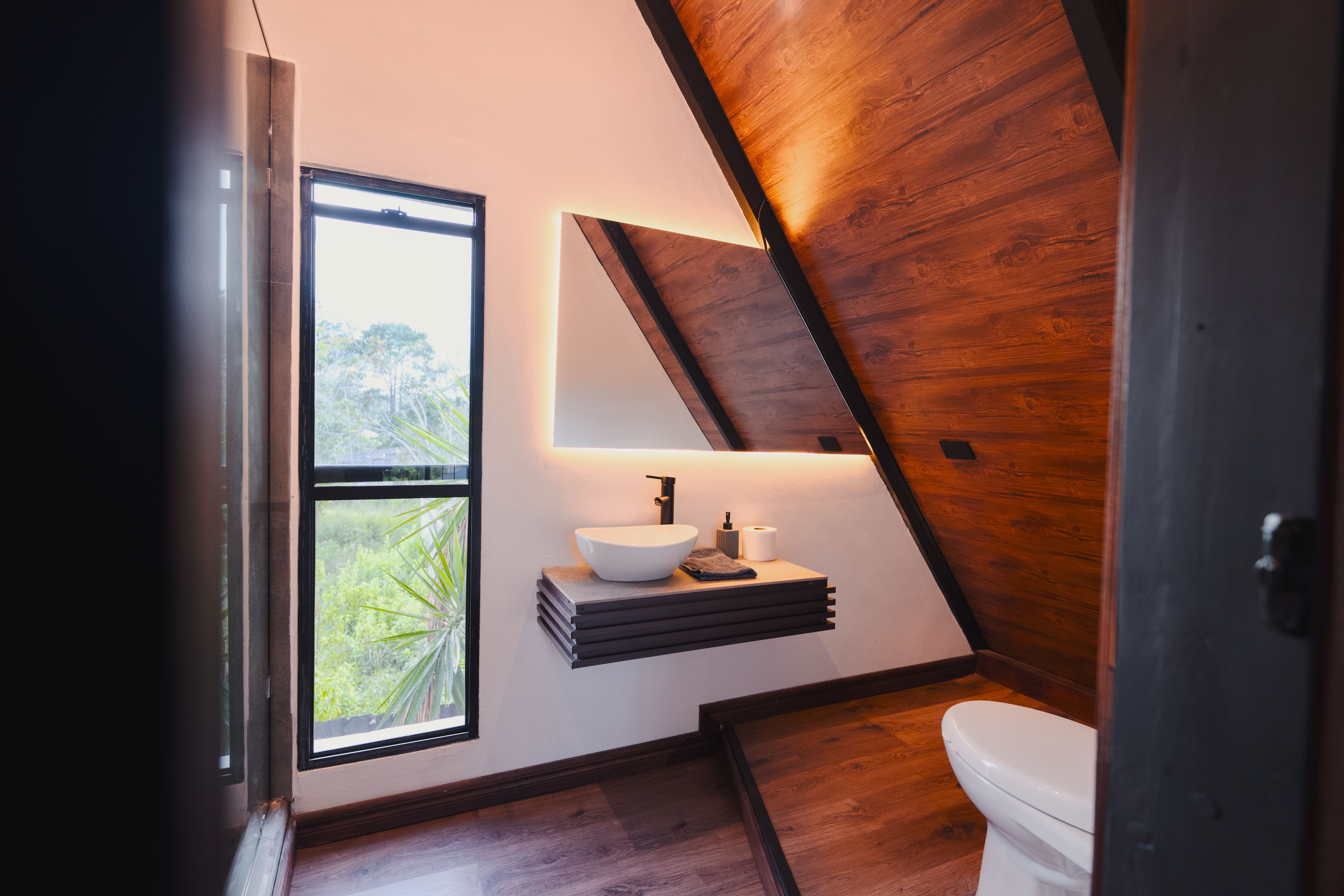 La cabaña cuenta con amplios ventanales que dejan entrar la luz natural y ofrecen vistas únicas del entorno, además de espacios cálidos que invitan a compartir momentos en familia o en pareja. Ya sea descansando en la terraza, disfrutando de una fogata bajo las estrellas o explorando los alrededores, cada instante se convierte en una experiencia inolvidable.
